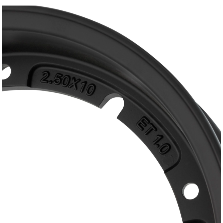 Nota: Esta jante, devido ao seu desvio no ET de 1mm, pode ser usada com pneus mais largos na medida 100/90-10 sem raspar na tampa de embraiagem. Pode ser montada também com pneu 3.50. Por exemplo: 100/90-10 atrás e 3.50-10 á frente.